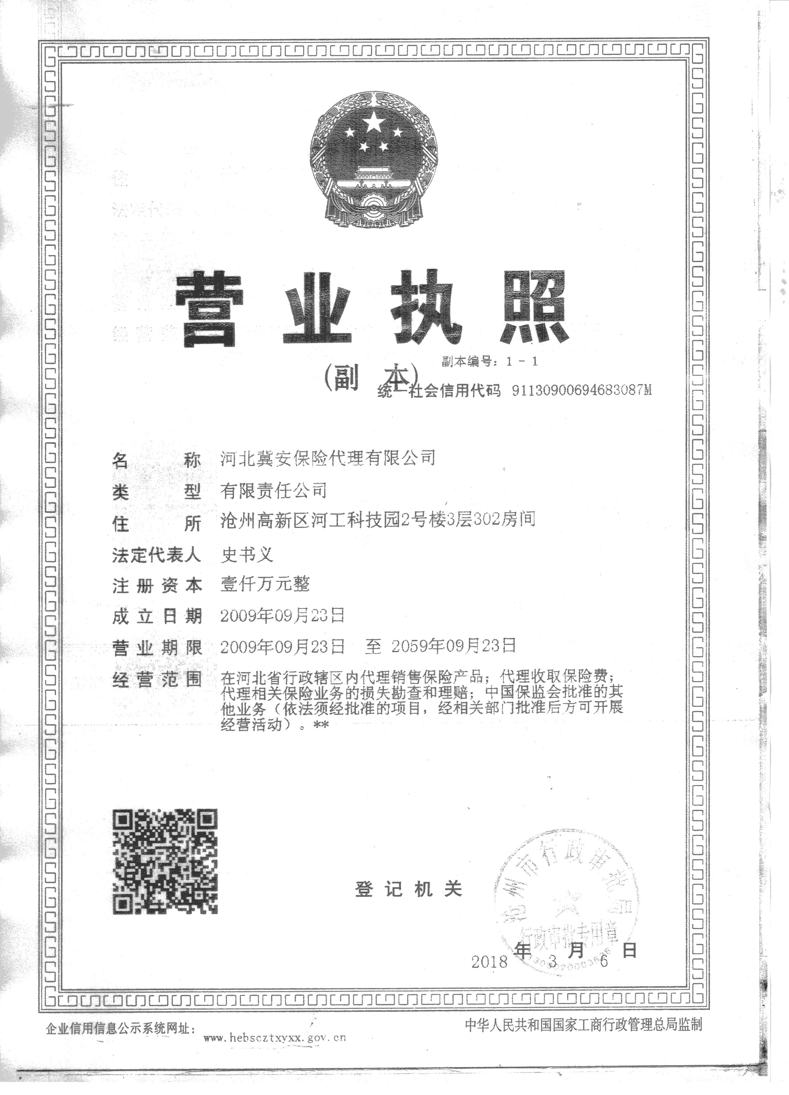 | 公司名称: | 河北冀安保险代理有限公司 | ||||