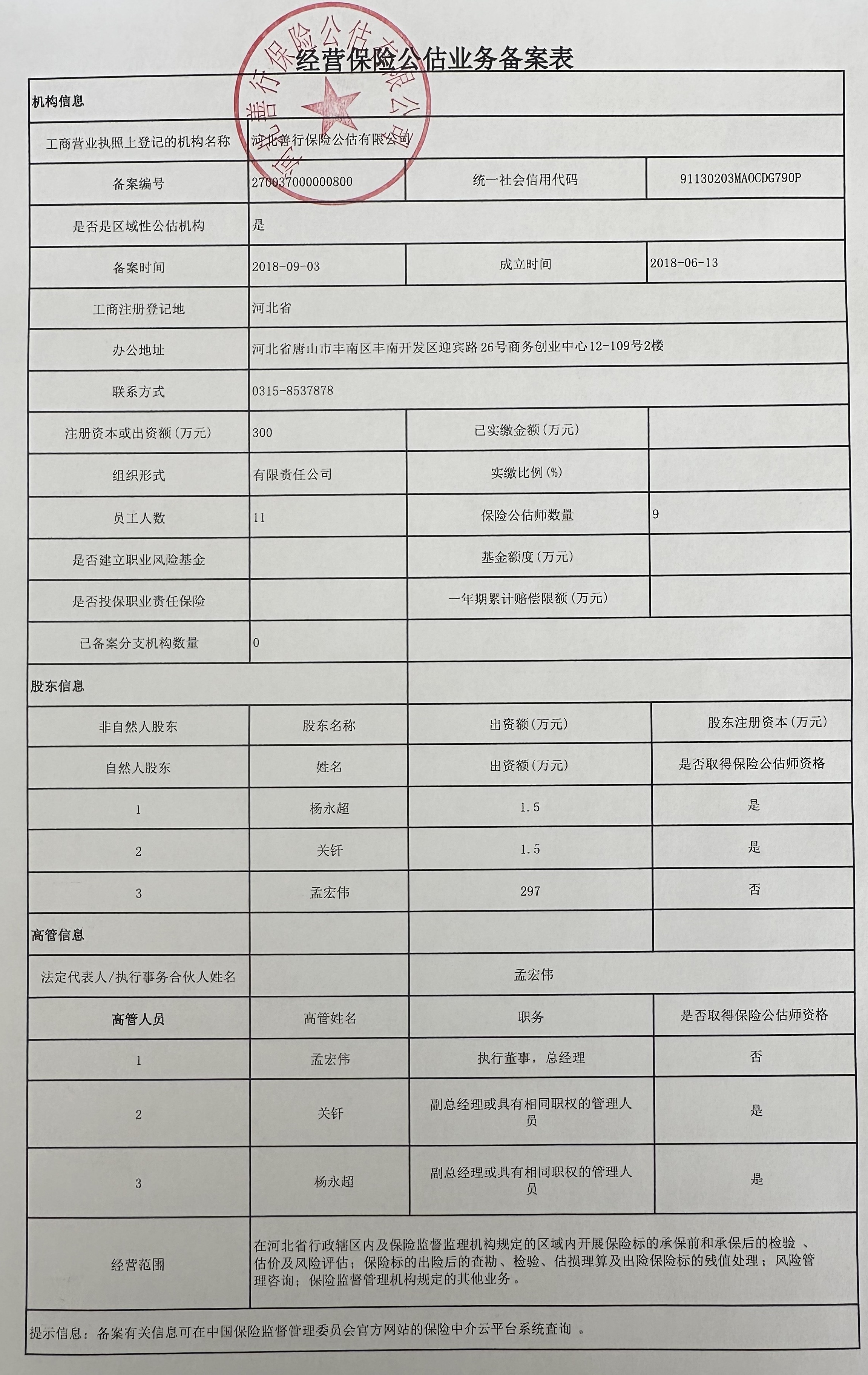 注册资本(万元): 300 法定代表人: 孟宏伟