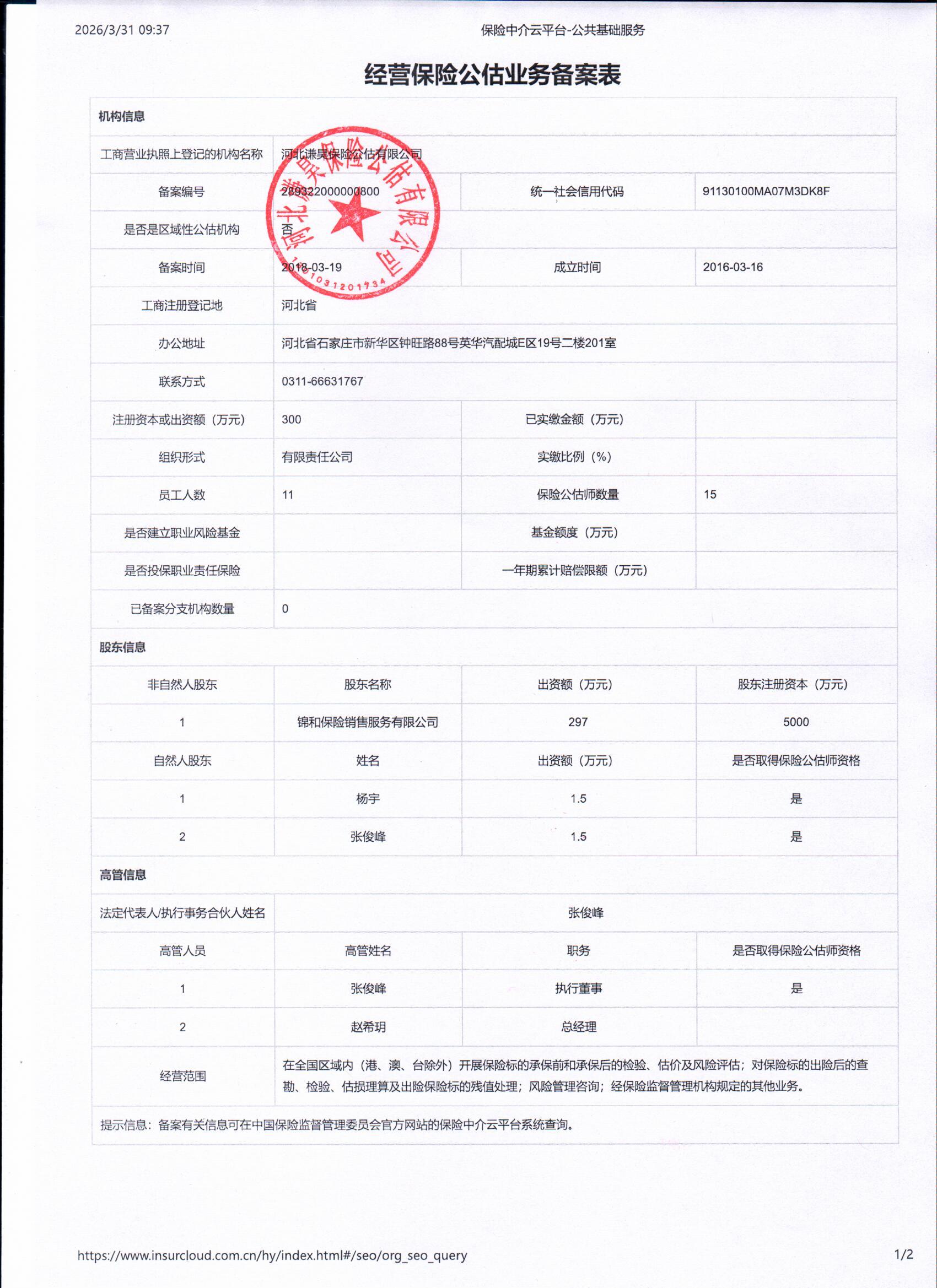 经营范围: 在全国区域内(港、澳、台除外)保险标的承保前和承保后的检验、估价及风险评估;对保险标的出险后的查勘、检验、估损理算及出险保险标的残值处理;风险管理咨询;经保险监督管理机构批准的其他业务
