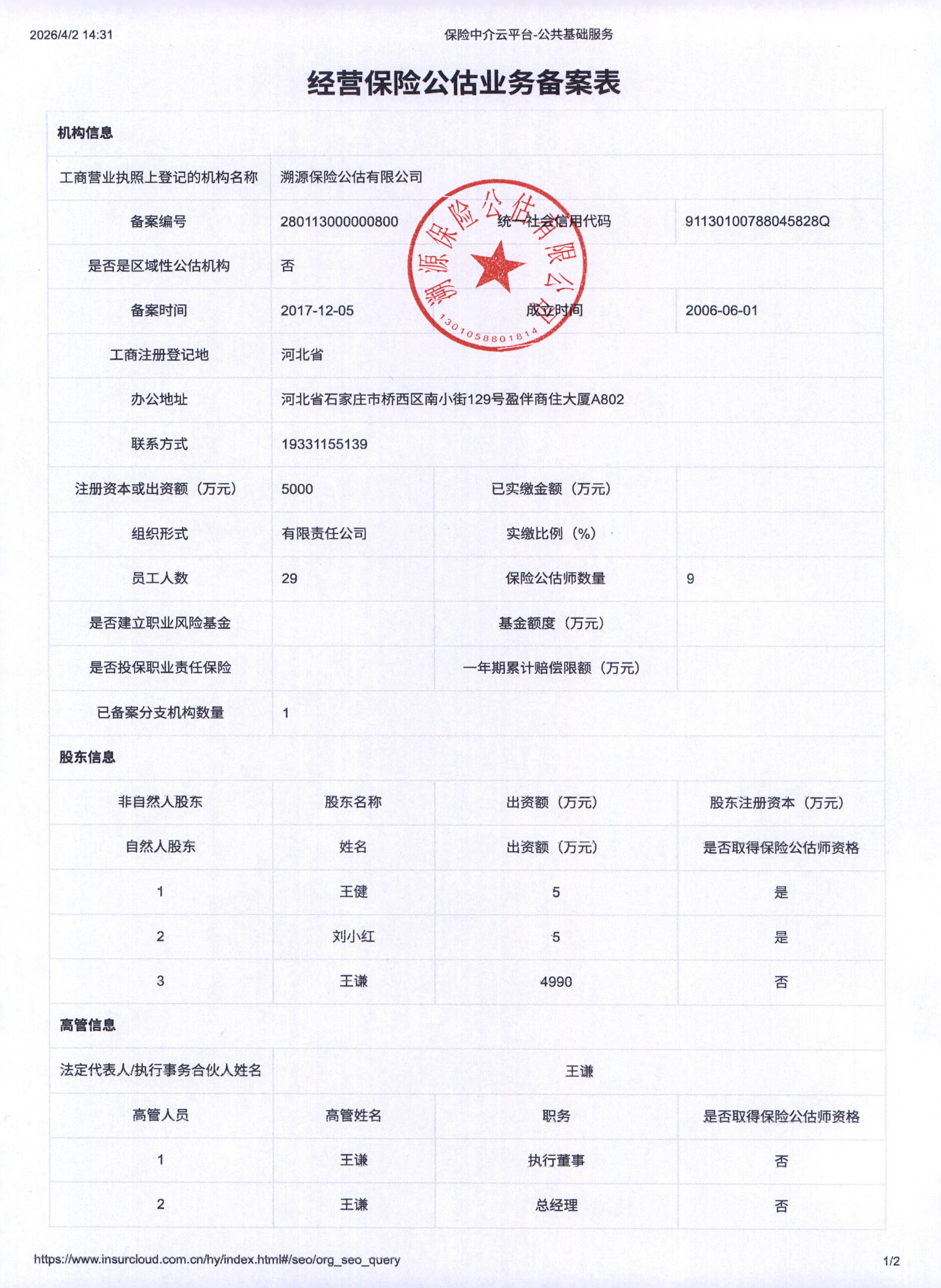 | 注册资本(万元): | 5000 | 法定代表人: | 王谦 | ||