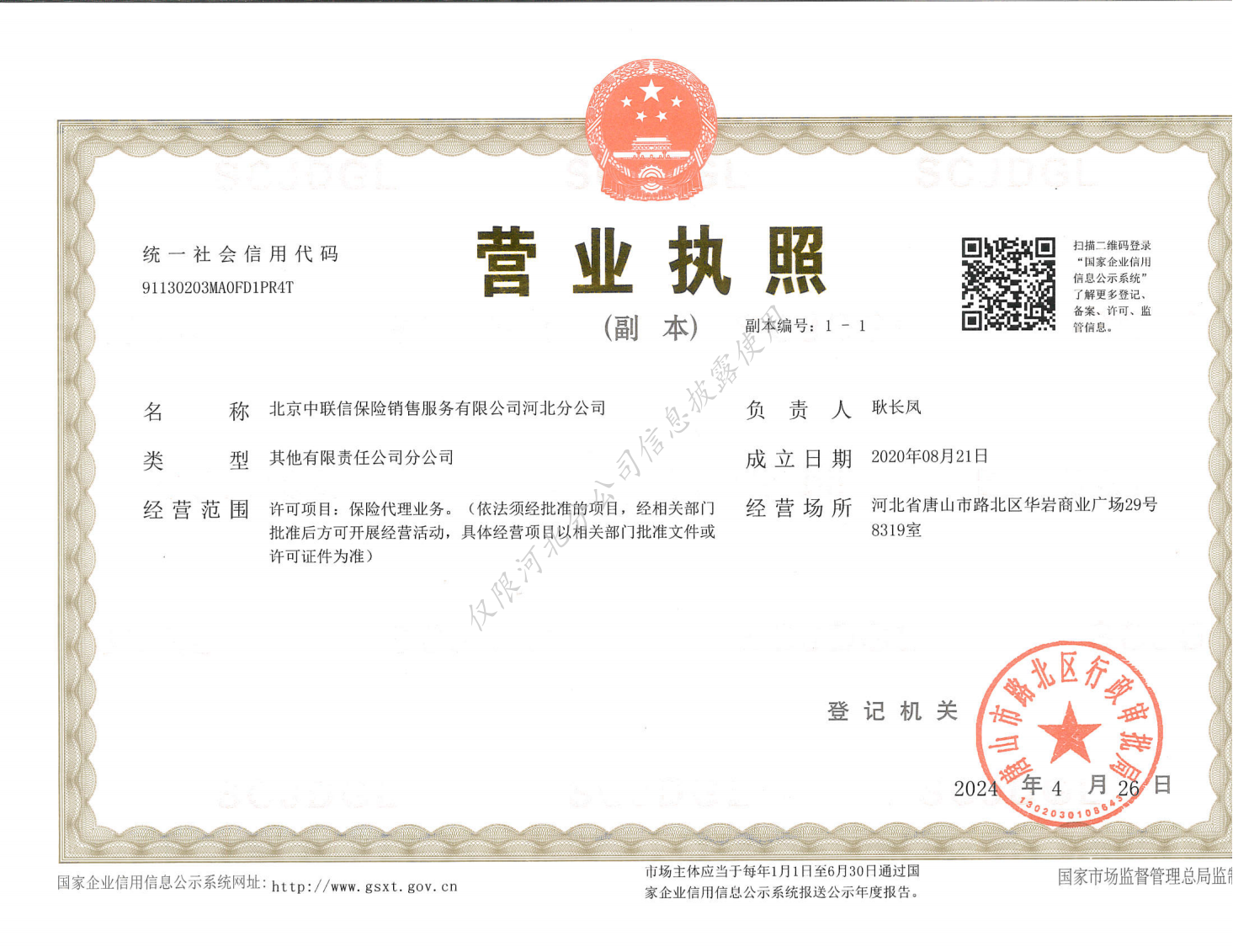 | 公司名称: | 北京中联信保险销售服务有限公司河北分公司 | ||||