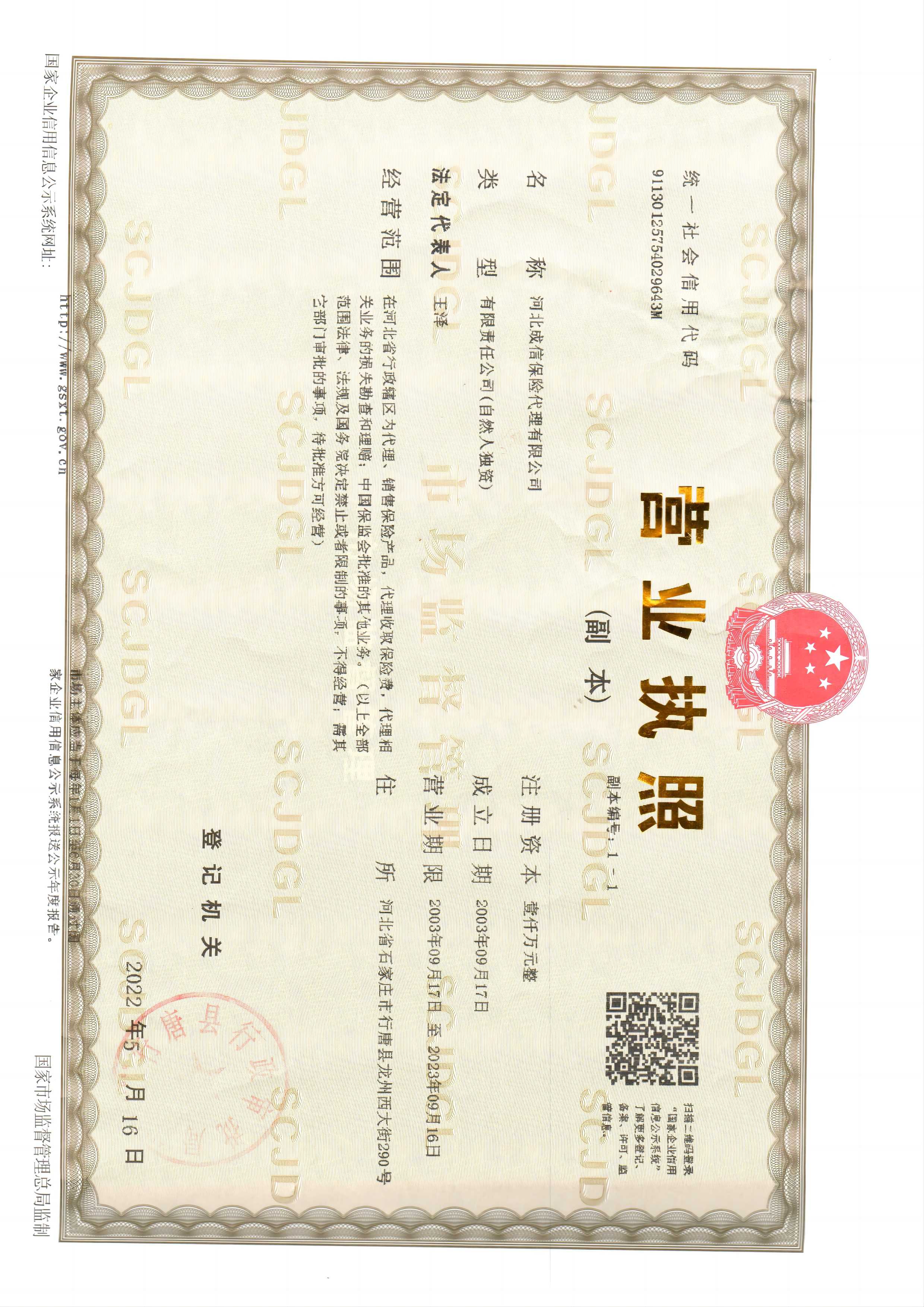 经营范围: 在河北省辖区内代理、销售保险产品,代理收取保险费,代理相关业务的损失勘察和理赔;中国保监会批准的其他业务。(以上全部范围法律、法规及国务院决定禁止或者限制的事项,不得经营;需其它部门审批的事项,待批准方可经营))