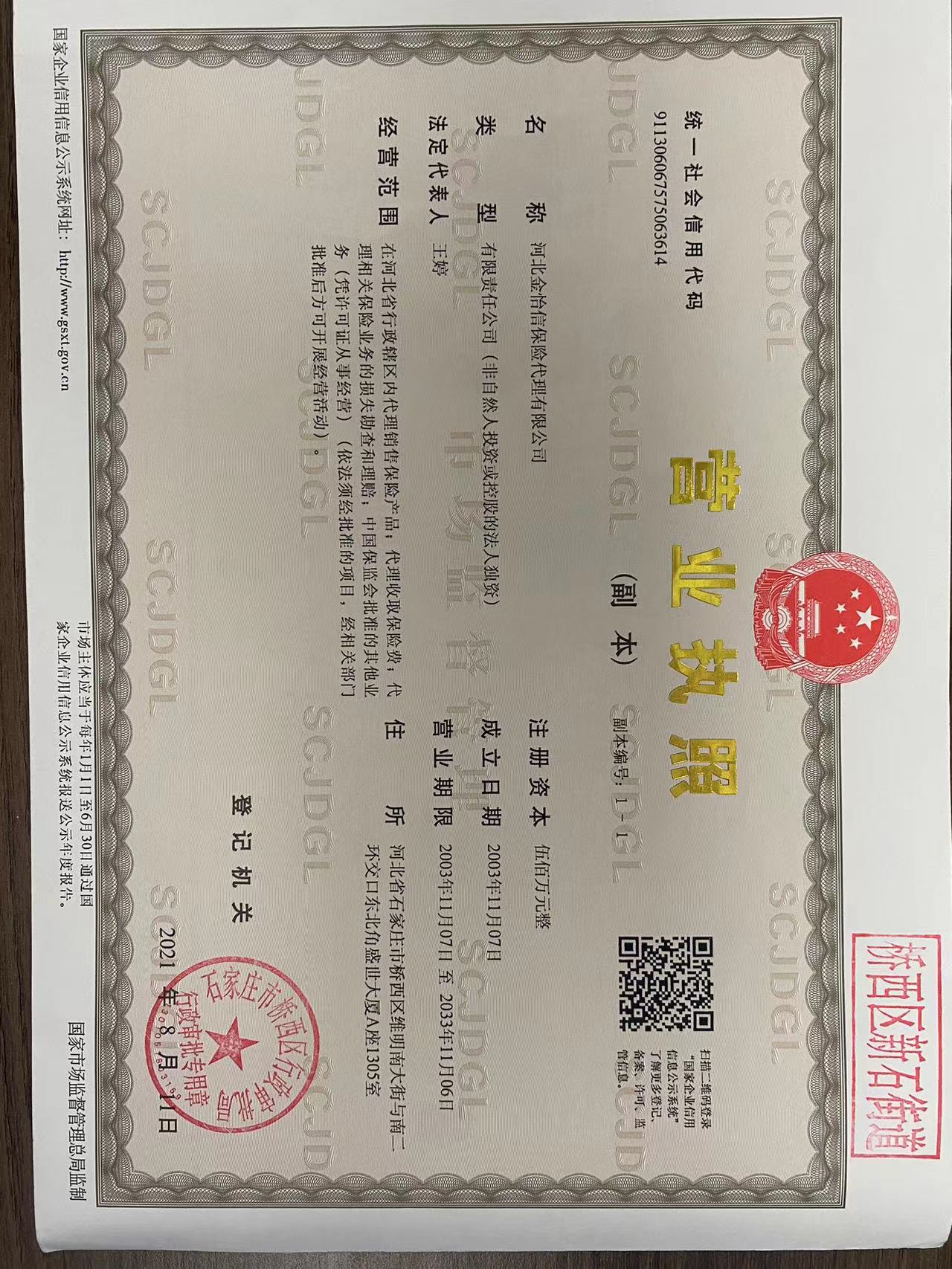 经营范围: 在河北省行政辖区内代理销售保险产品;代理收取保险费;代理相关保险业务的损失勘察和理赔