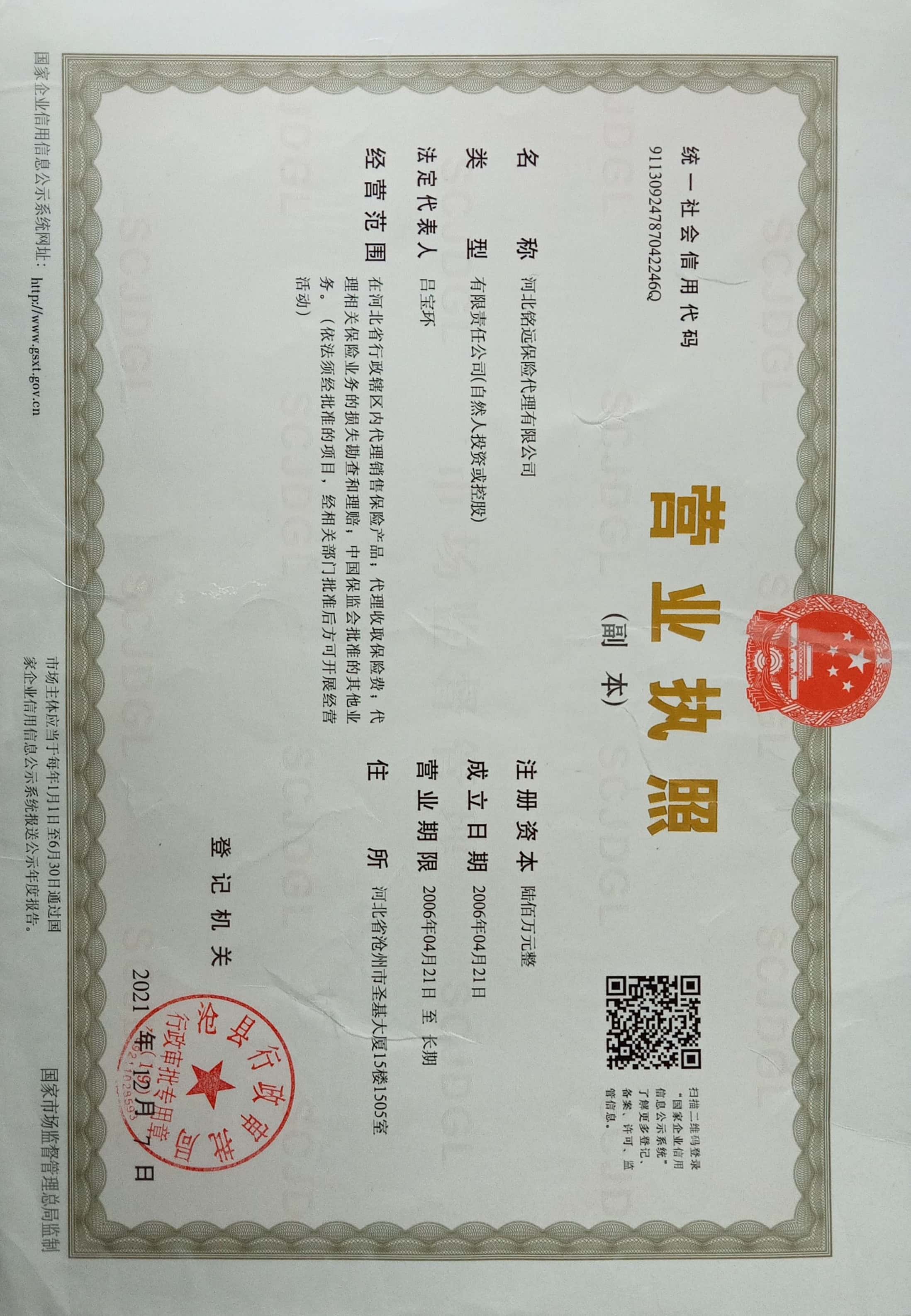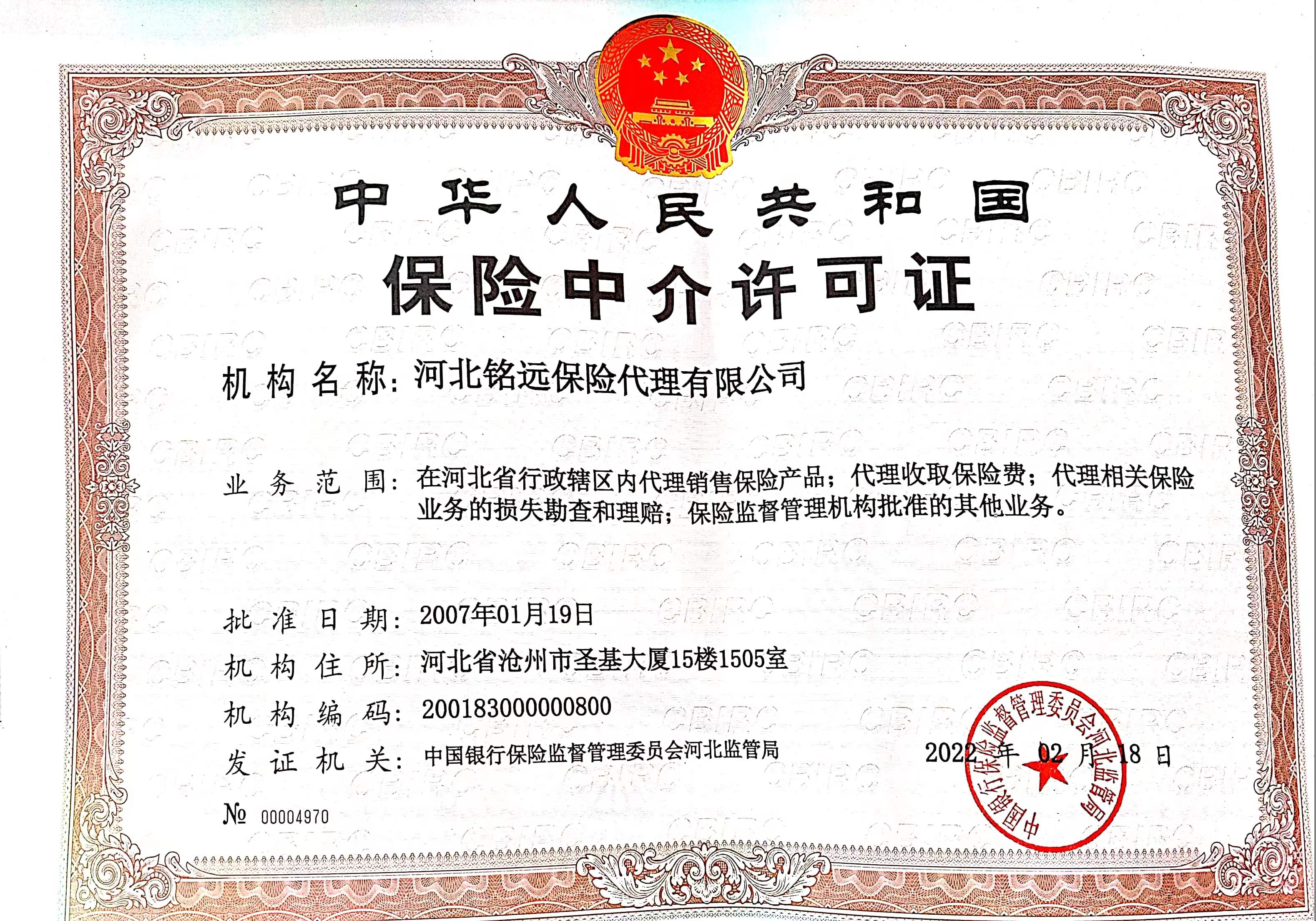 | 公司名称: | 河北铭远保险代理有限公司 | ||||