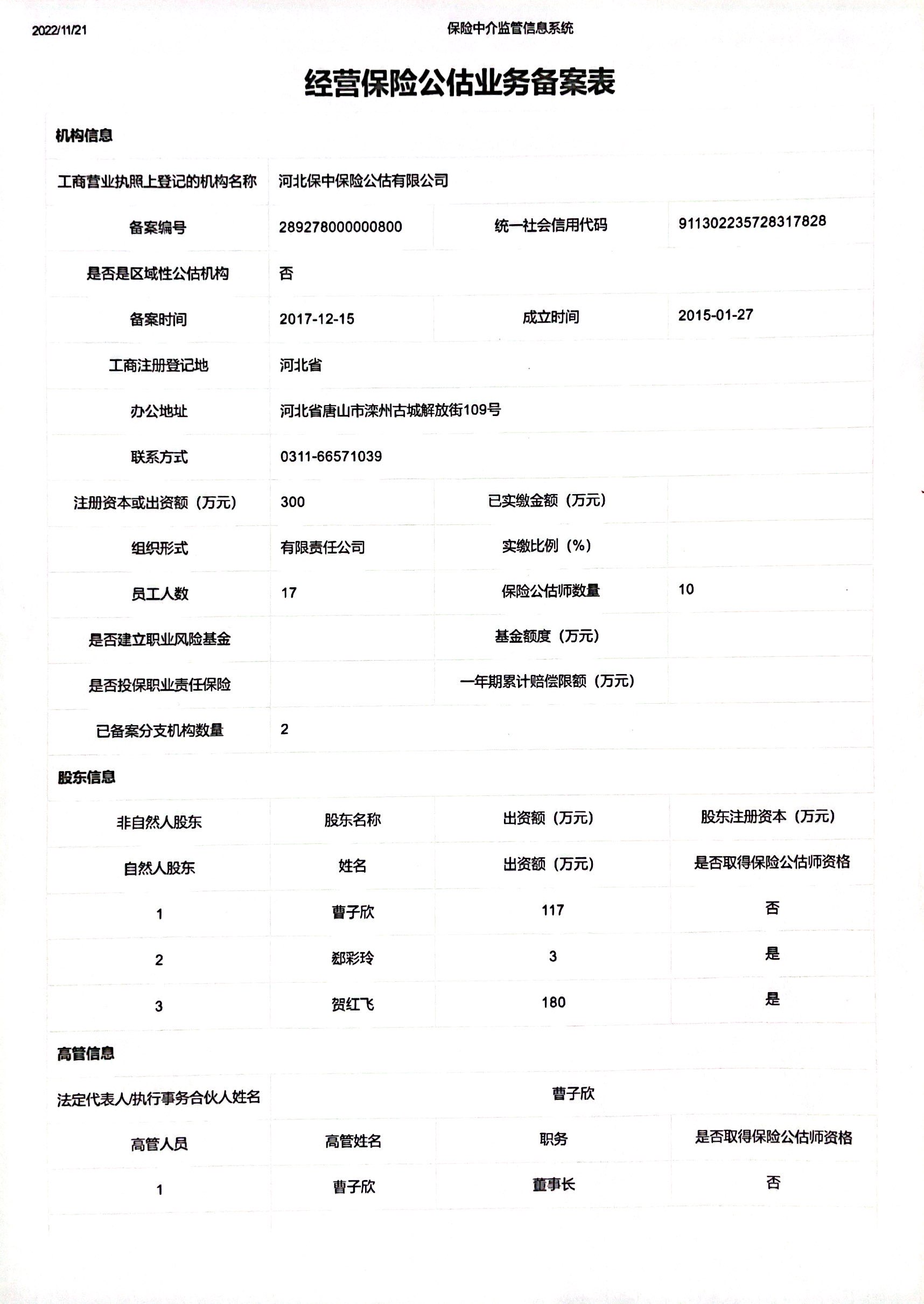 | 公司名称: | 河北保中保险公估有限公司 | ||||