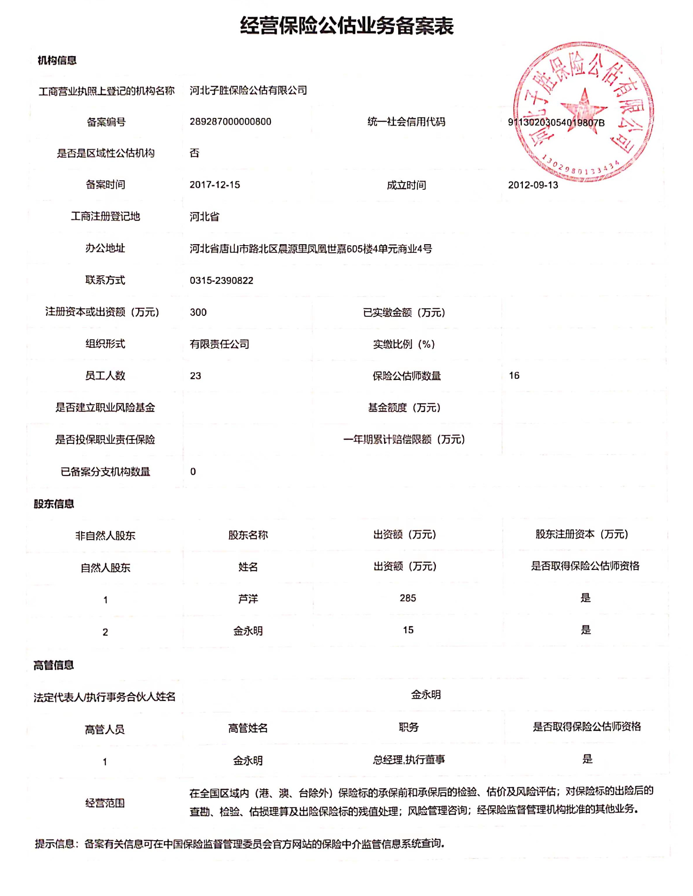 信息披露>河北子胜保险公估有限公司