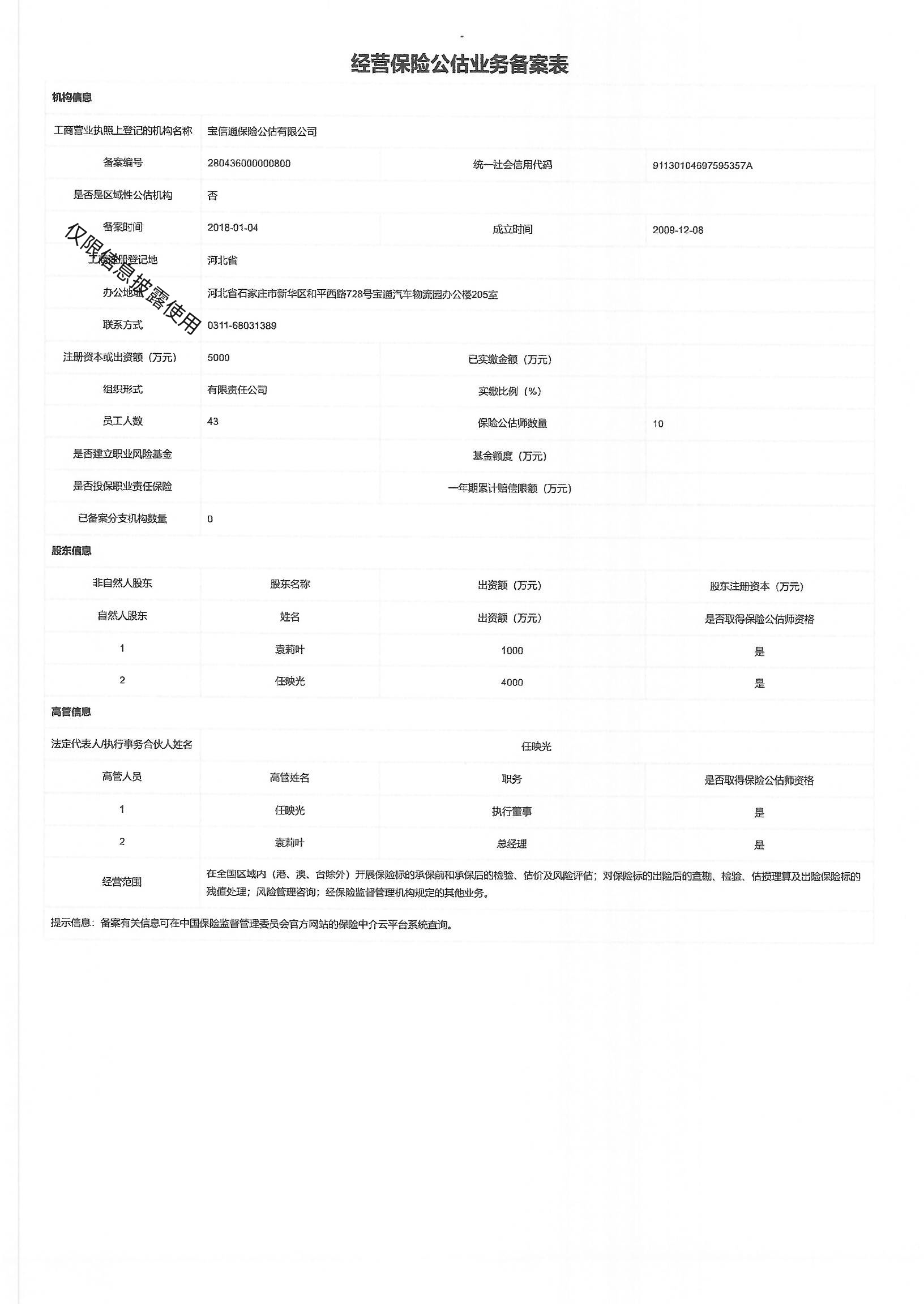 | 公司名称: | 宝信通保险公估有限公司 | ||||
