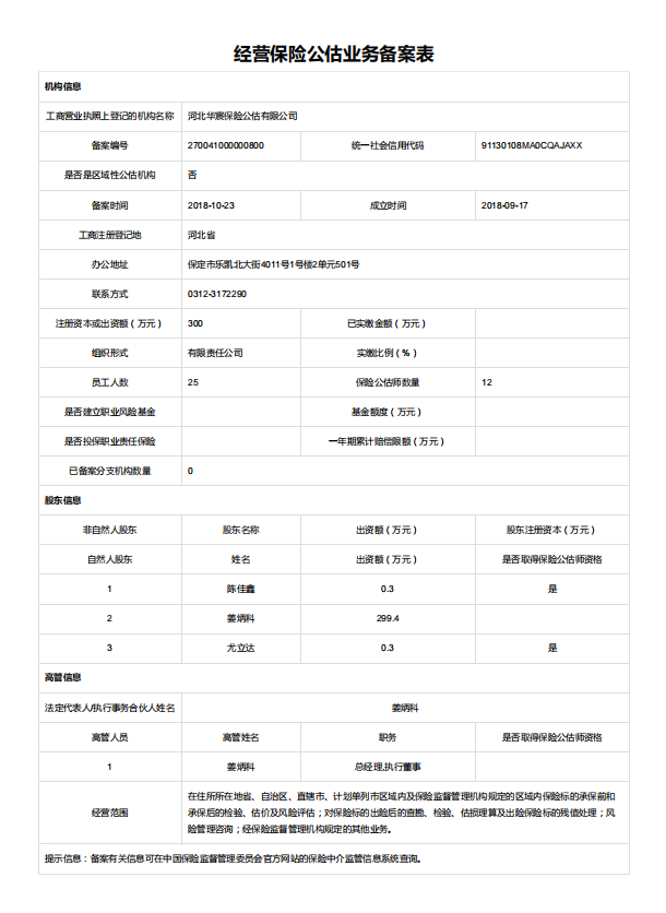 | 公司名称: | 河北华宸保险公估有限公司 | ||||