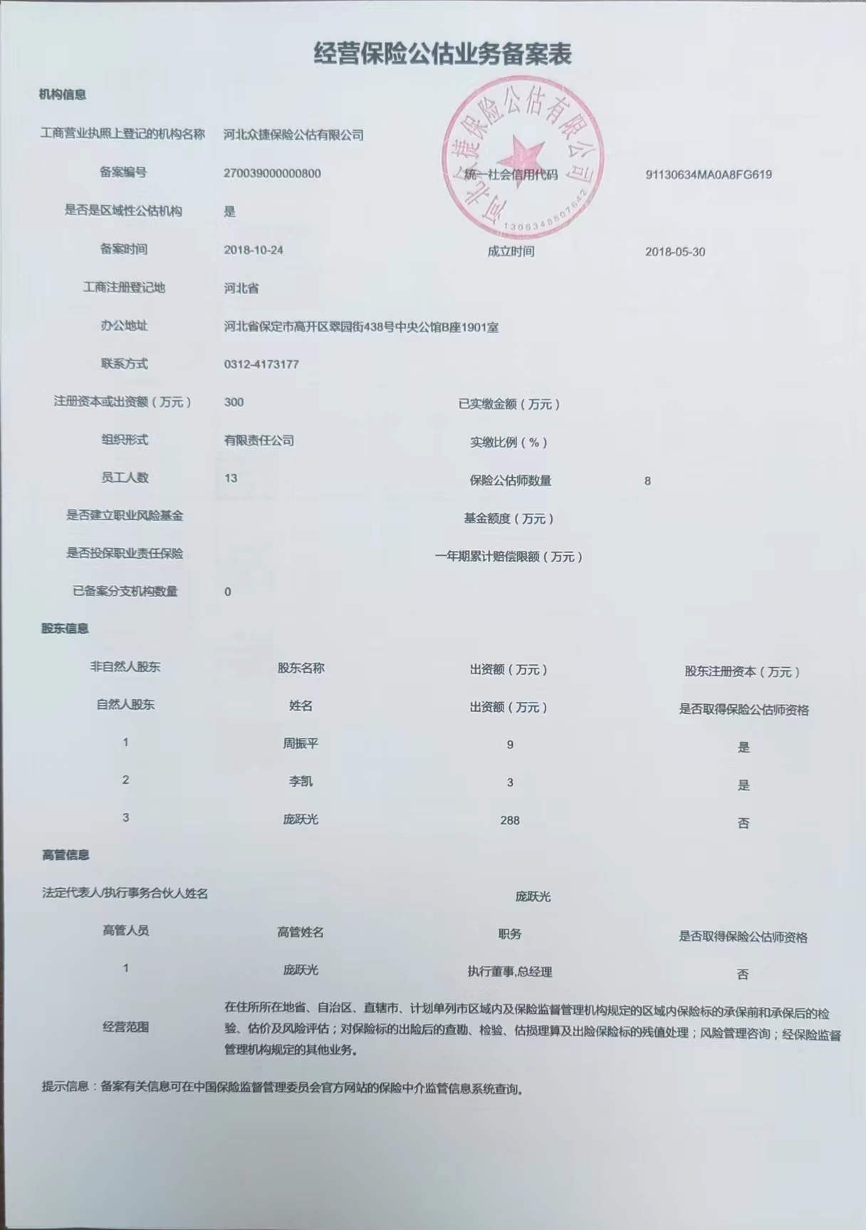 注册资本(万元): 300 法定代表人: 庞跃光