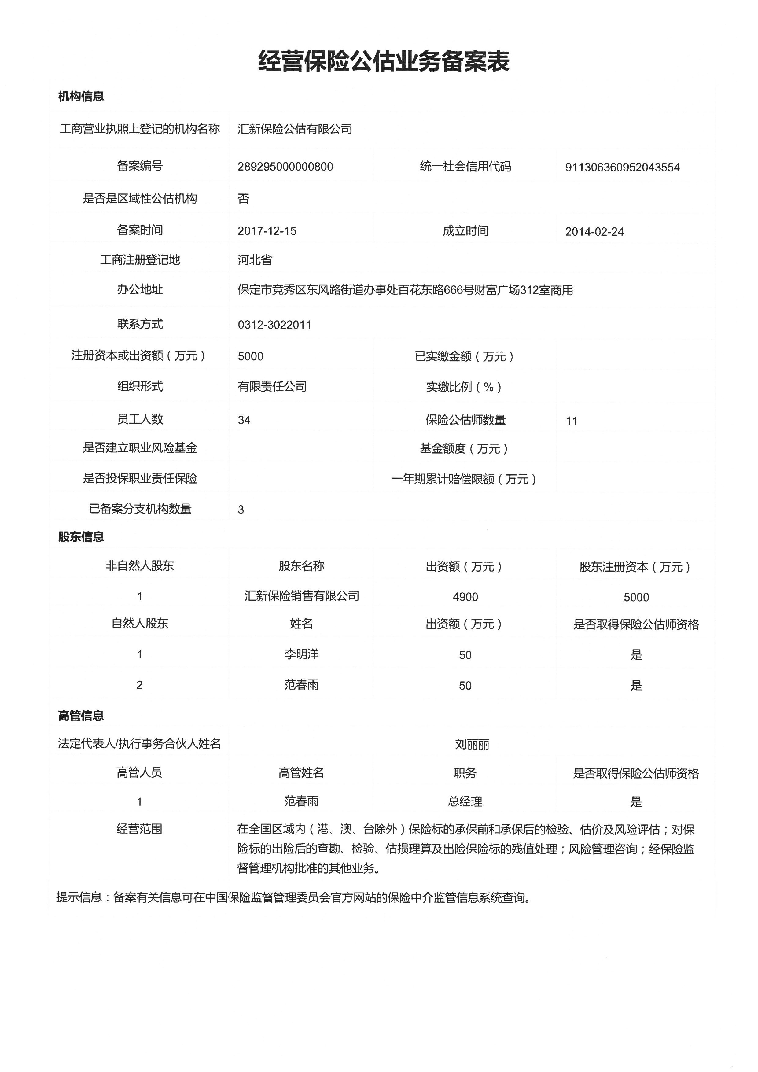 信息披露>汇新保险公估有限公司