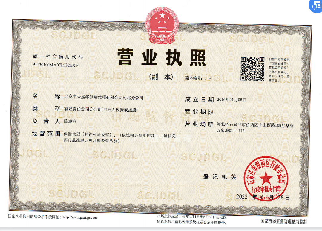 公司名称: 北京中天嘉华保险代理有限公司河北分公司