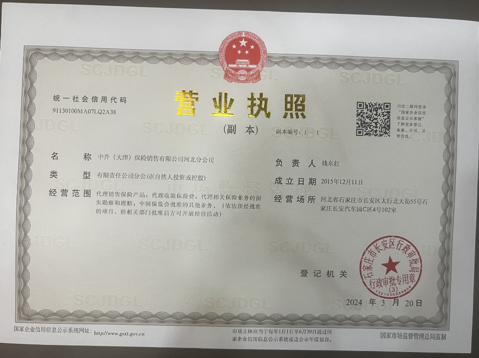 公司名称: 中升(天津)保险销售有限公司河北分公司