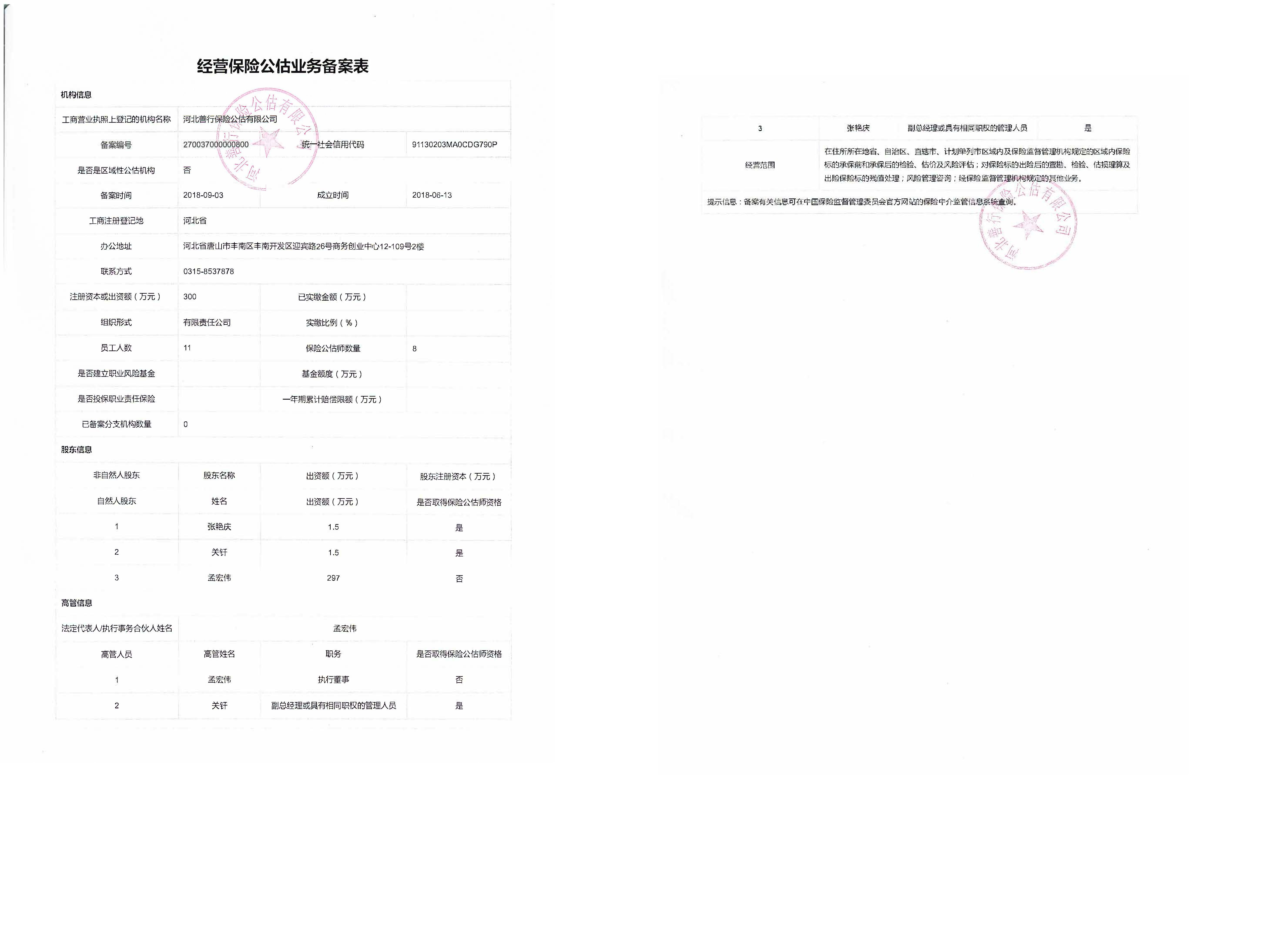 经营范围: 在住所所在地省、自治区、直辖市、计划单列市区域内及保险监督管理机构规定的区域内保险标的承保前和承保后的检验、估价及风险评估;对保险标的出险后的查勘、检验、估损理算及出险保险标的残值处理;风险管理咨询;经保险监督管理机构规定的其他业务
