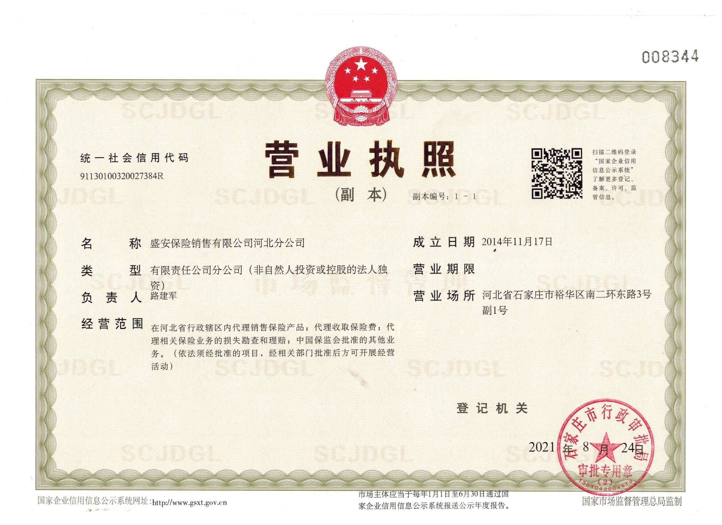 公司名称: 盛安保险销售有限公司河北分公司