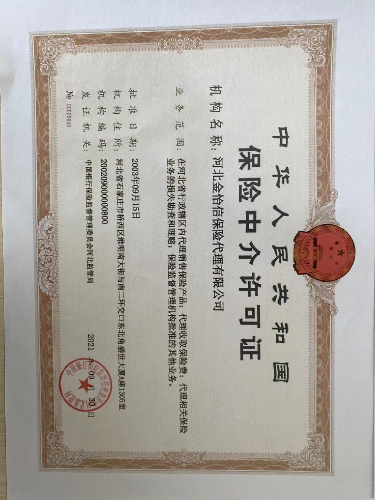 经营范围: 在河北省行政辖区内代理销售保险产品;代理收取保险费;代理相关保险业务的损失勘察和理赔